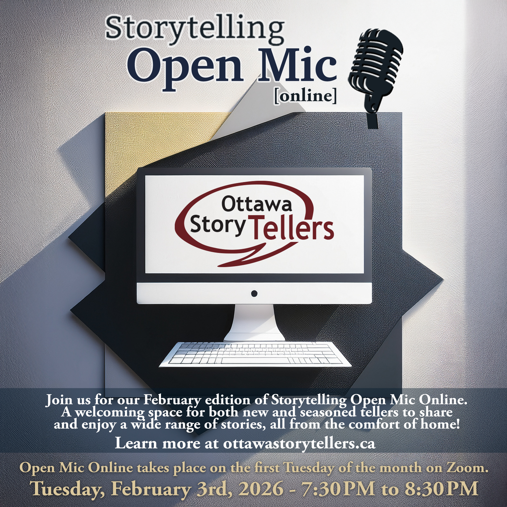 Storytelling Open Mic Online takes place on the first Tuesday of the month from 7:30pm to 9:00pm on Zoom.