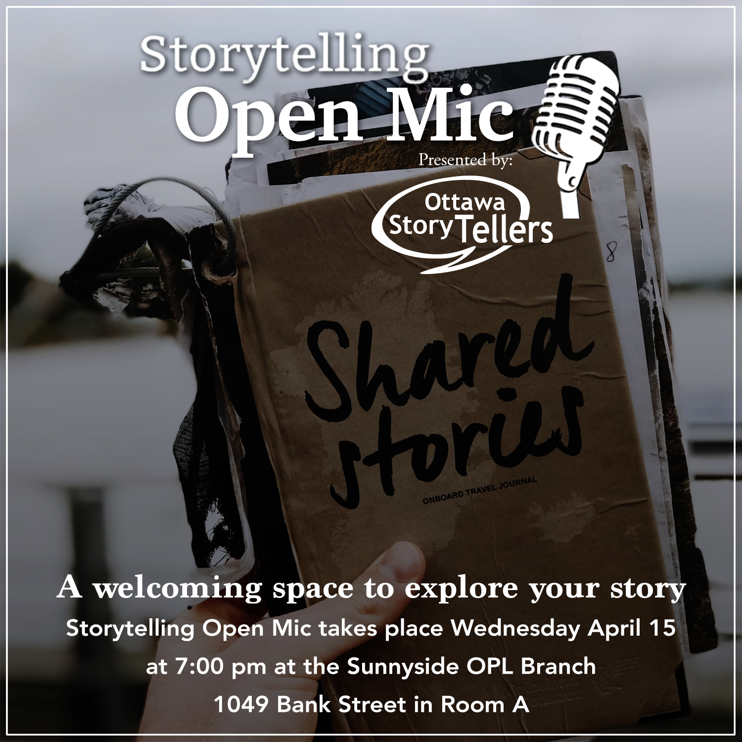 Our in-person Storytelling Open Mic takes place monthly on Wednesday April 15th at 7:00 pm at the Sunnyside OPL Branch (1049 Bank Street) in Room A. In-person Open Mic is hosted by Véronique Dupuis.